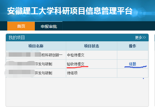 进入系统平台后,在首页—我的项目中点击“更多” (如图1所示),进入“我的项目”菜单(如图2所示),选择需要结题的项目,如显示“任务书—中检—提交”,请点击“任务书”,填写并保存,再点击“中检”,填写中期检查表并保存,然后点击“提交”,提交后请及时联系科研管理科审核通过,待审核通过后,系统会显示状态为“验收待提交”(如图3所示),请点击“更多”进入“我的项目”菜单,点击“结题”,填写结题报告并保存,点击“成果”上传附件材料,最后点击“提交”,提交后请及时联系科研管理科审核。