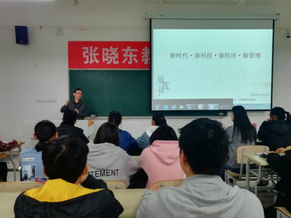 张晓东从全球互联技术驱动的新时代出发,围绕机器智能、云计算、物联网、智能科技、区块链等新科技发展,讨论服务经济、数字经济对社会发展的贡献,提出丄型管理和管理的趋势等问题。报告会向同学们介绍了科技、经济、管理领域的前沿知识,给大家带来了一场新时代视野下管理学的学术盛宴,极大地鼓舞了同学们的学习热情。张晓东的学术报告深入浅出,语言幽默,讲到精彩之处,大家纷纷报以热烈的掌声。