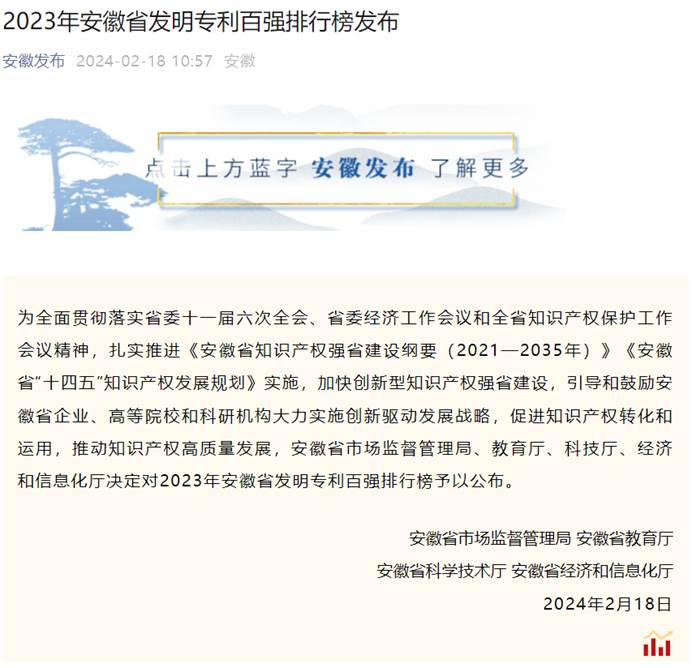 近日,安徽省市场监督管理局、教育厅、科学技术厅、经济和信息化厅联合发布了《2023年安徽省发明专利百强排行榜》。我校继2021年排名第9位,2022年排名第8位,2023年跃升至总排名的第7位,高校排名仅次于合肥工业大学和中国科学技术大学,连续2年位居省属高校第一。