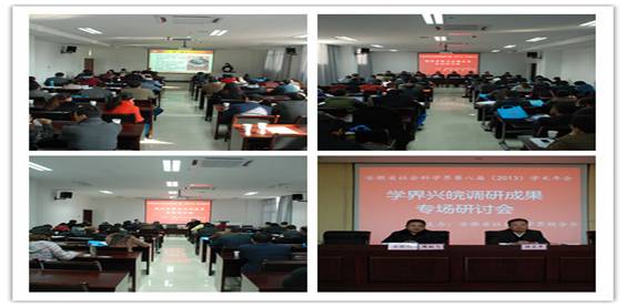 12月1日,以“美好安徽圆梦中国:自信•自觉•自强”为主题的安徽省社会科学界第八届(2013)学术年会在合肥举行。省委常委、宣传部长曹征海发表书面讲话,要求社科界为全面深化改革贡献智慧和力量。省政协副主席赵韩出席大会开幕式并致辞,省社科联党组书记、常务副主席刘飞跃主持开幕式。来自省内高等院校、科研院所、学术团体、党政机关和企事业单位的专家学者400多人与会,我校人文学院教师莫良元和代大为应邀参加了此次年会。