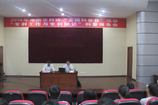 9月23日上午,2014年淮南市科协“全国科普日”活动在我校六角楼报告厅举行。活动邀请了安徽省知识产权局常务副局长刘栋为广大师生作了题为“专利工作与专利知识”的科普报告会。报告会由淮南市科协党组书记、副主席李洪主持。