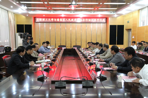 10月13日下午,安徽理工大学与潘集区人民政府校地合作协议签字仪式在图书馆一楼北会议室举行。淮南市副市长、潘集区委书记蔡宜骅,淮南市政协副主席、科学技术局局长吴健,潘集区委副书记、区长潘奇志,潘集区委常委、副区长王彤以及安徽理工大学校长郭永存,副校长王其东、孟祥瑞出席会议。会议由孟祥瑞主持。