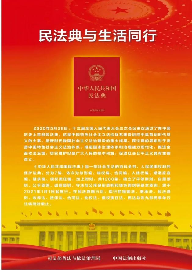 2021年1月1日起正式施行的《中华人民共和国民法典》,被称为“社会生活的百科全书”,是新中国第一部以法典命名的法律,在法律体系中居于基础性地位,也是市场经济的基本法。《中华人民共和国民法典》共7编1260条,有总则编、物权编、合同编、人格权编、婚姻家庭编、继承编、侵权责任编七大部分。
