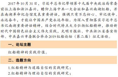 2017年10月31日,习近平总书记带领第十九届中央政治局常委前往上海和浙江嘉兴,瞻仰上海中共一大会址和嘉兴南湖红船,并在南湖革命纪念馆发表重要讲话,强调只有不忘初心、牢记使命、永远奋斗,才能让中国共产党永远年轻。为深入贯彻落实习近平总书记南湖重要讲话精神,结合时代特点大力弘扬红船精神,推动新时代中国特色社会主义伟大实践,光明日报社、中共浙江省委宣传部、中共嘉兴市委联合举办2019红船论坛(第二届)征文活动。