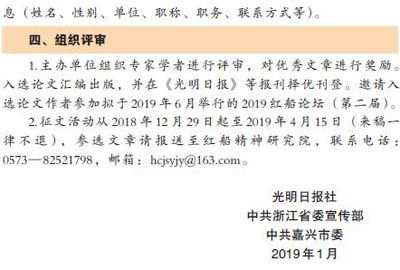 2.征文活动从即日起至2019年4月15日(来稿一律不退),参选文章请报送至红船精神研究院,联系电话:0573—82521798,邮箱:hcjsy@163.com。