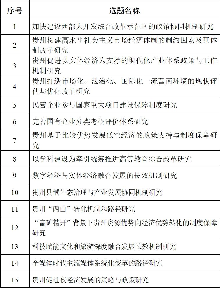 为充分发挥社科界服务党委政府科学决策的“思想库”“智囊团”作用,激励和引导广大社科理论工作者关注贵州改革实践、服务决策,及时推出一批针对性可行性强的研究成果,设立贵州省“贯彻落实党的二十届三中全会精神”哲学社会科学规划专项课题(以下简称专项课题),面向全国公开申报,现将有关事宜公告如下。